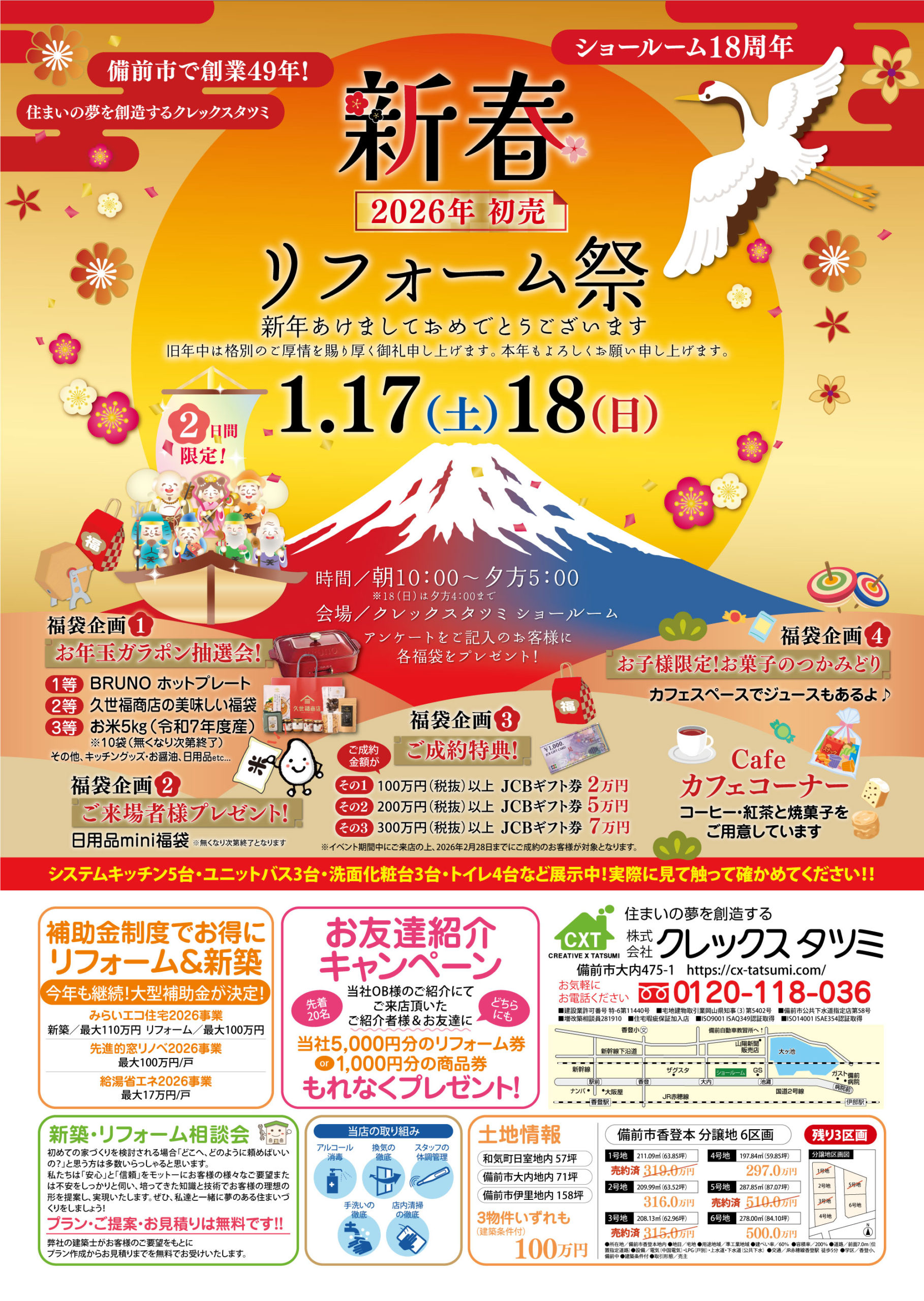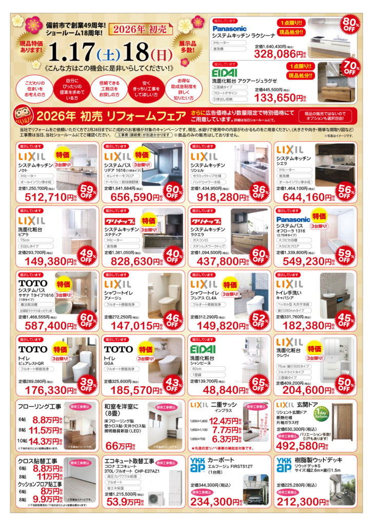 1/17(土)18(日)★新春 初売り★リフォーム祭 2026.01.08 明けましておめでとうございます。本年もよろしくお願い申し上げます。 おかげ様で創業49年!ショールーム18周年! 感謝の気持ちを込めまして、お年玉ガラポン抽選会などの福袋企画をご用意しております。 皆様のお越しを心よりお待ちしております。 Tweet Share 6/21(土)22(日)リフォーム相談会 2020.09.05 ホームページをリニューアル 2021.04.20 SW(SUPER WALL) ZEH住宅 新築工事 着工~基礎完了 2021.04.27 SW(SUPER WALL)ZEH住宅 新築工事 上棟 2021.05.25 SW(SUPER WALL)ZEH住宅 新築工事 2021.06.01 SW(SUPER WALL)ZEH住宅 新築工事 2021.06.02 グリーン住宅ポイントのお知らせ 2021.06.21 SW(SUPER WALL)ZEH住宅 新築工事 2021.07.23 SW(SUPER WALL)ZEH住宅 新築工事 2021.08.02 完成見学会のお知らせ(8月7・8日の2日間限定) 2021.08.10 完成見学会(8月7日・8日)の報告